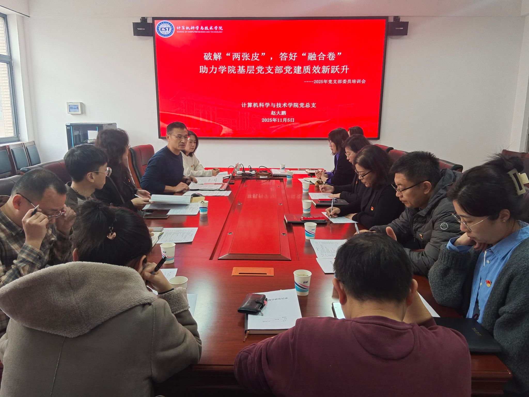 赵大鹏结合学院实际情况与相关文件要求,围绕“七个有力”和党建“双创”努力方向,深入讲解基层党建工作要点。他指出,破解党建与业务“融合不够紧密”难题,是推动党建工作与教学、科研等工作深度融合的关键。培训内容丰富详实,从学院基层党组织概况、基层党组织建设指南,到党建“双创”具体实施路径,为支部委员们上了生动一课。