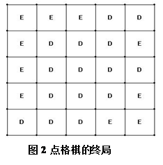 5) 占领格子较多的一方为获胜方。终局如图2所示,E、D分别为双方的标示棋子。